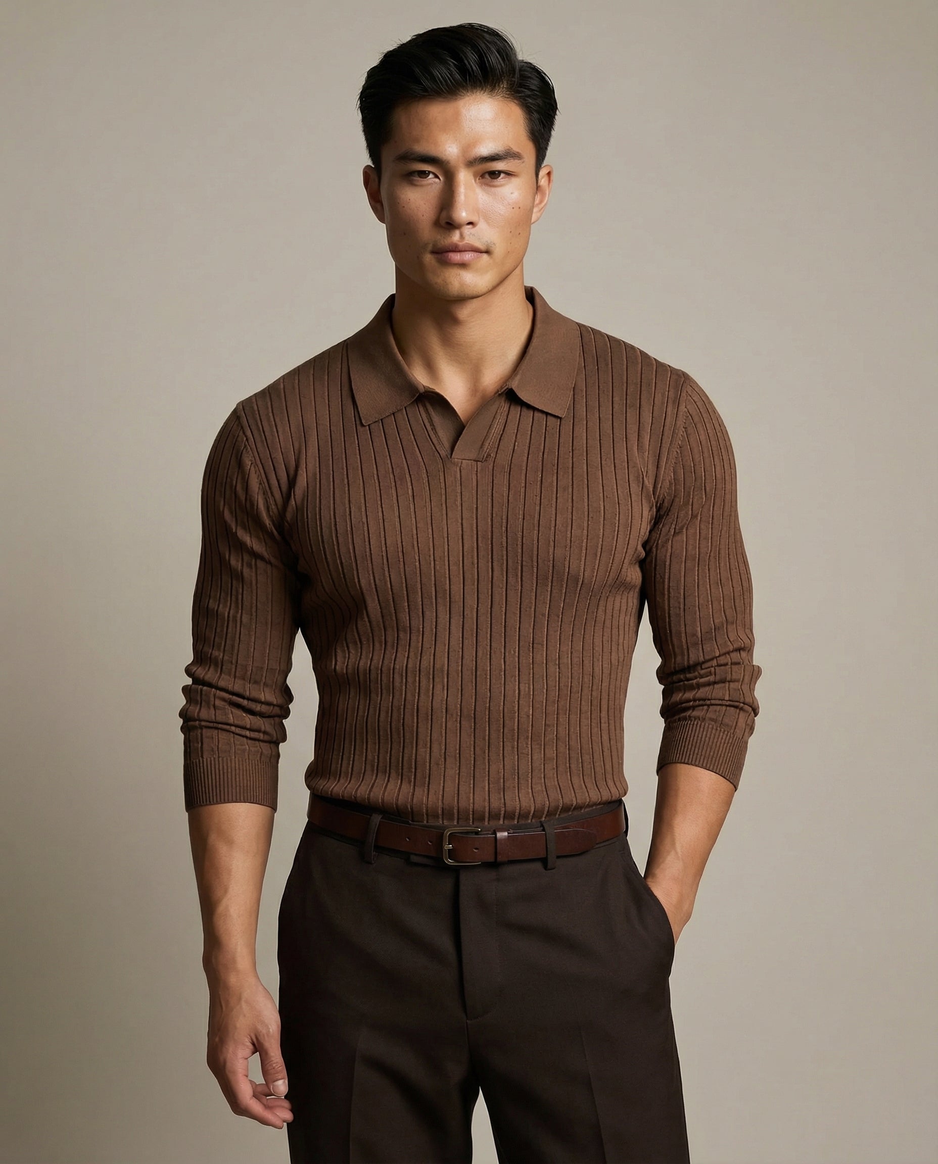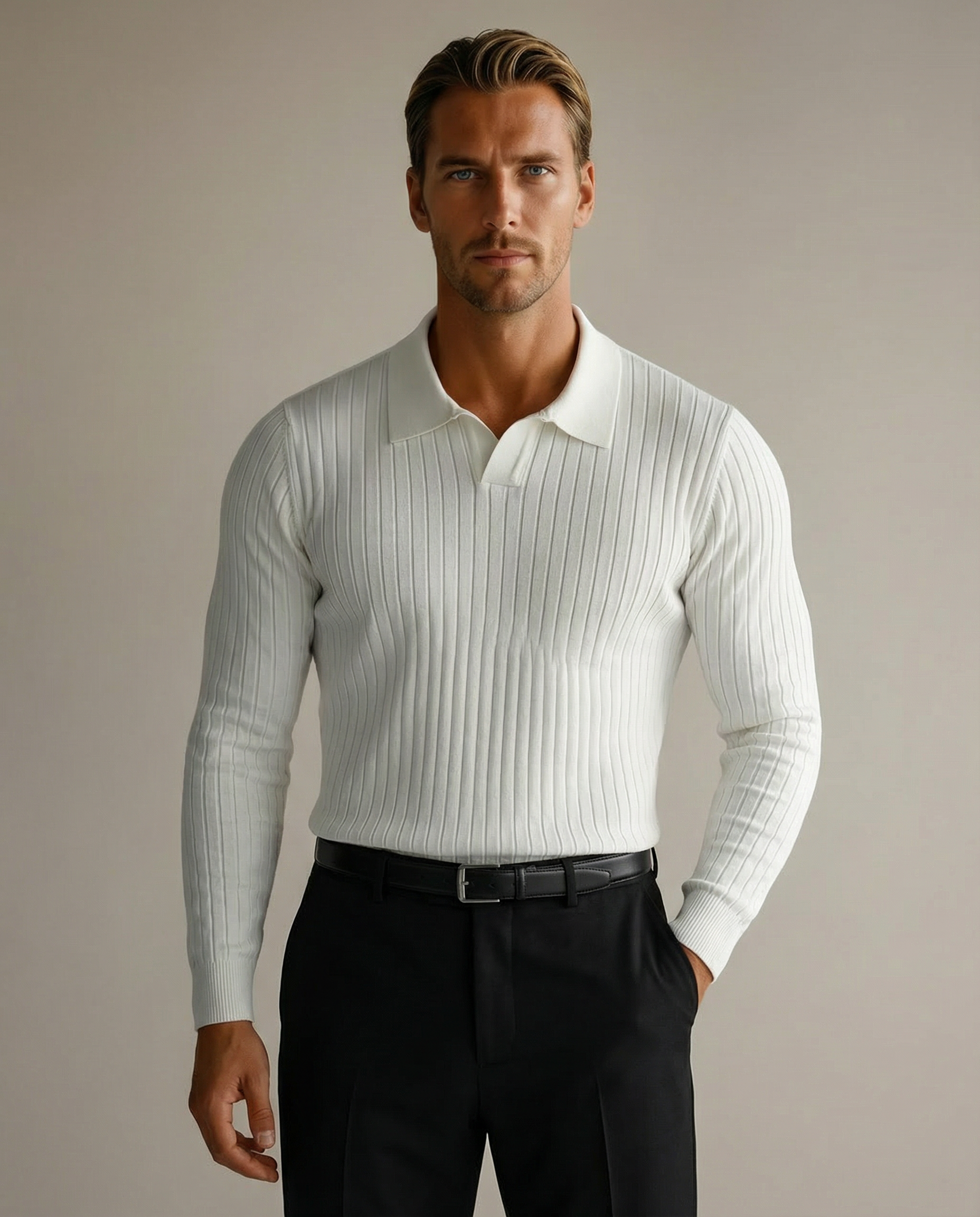 Crafted from a soft, breathable knit with natural stretch, The Belmore Polo contours the body in all the right places while maintaining a polished, composed finish. The ribbed structure adds depth and definition, delivering a confident, masculine profile without feeling overstated.