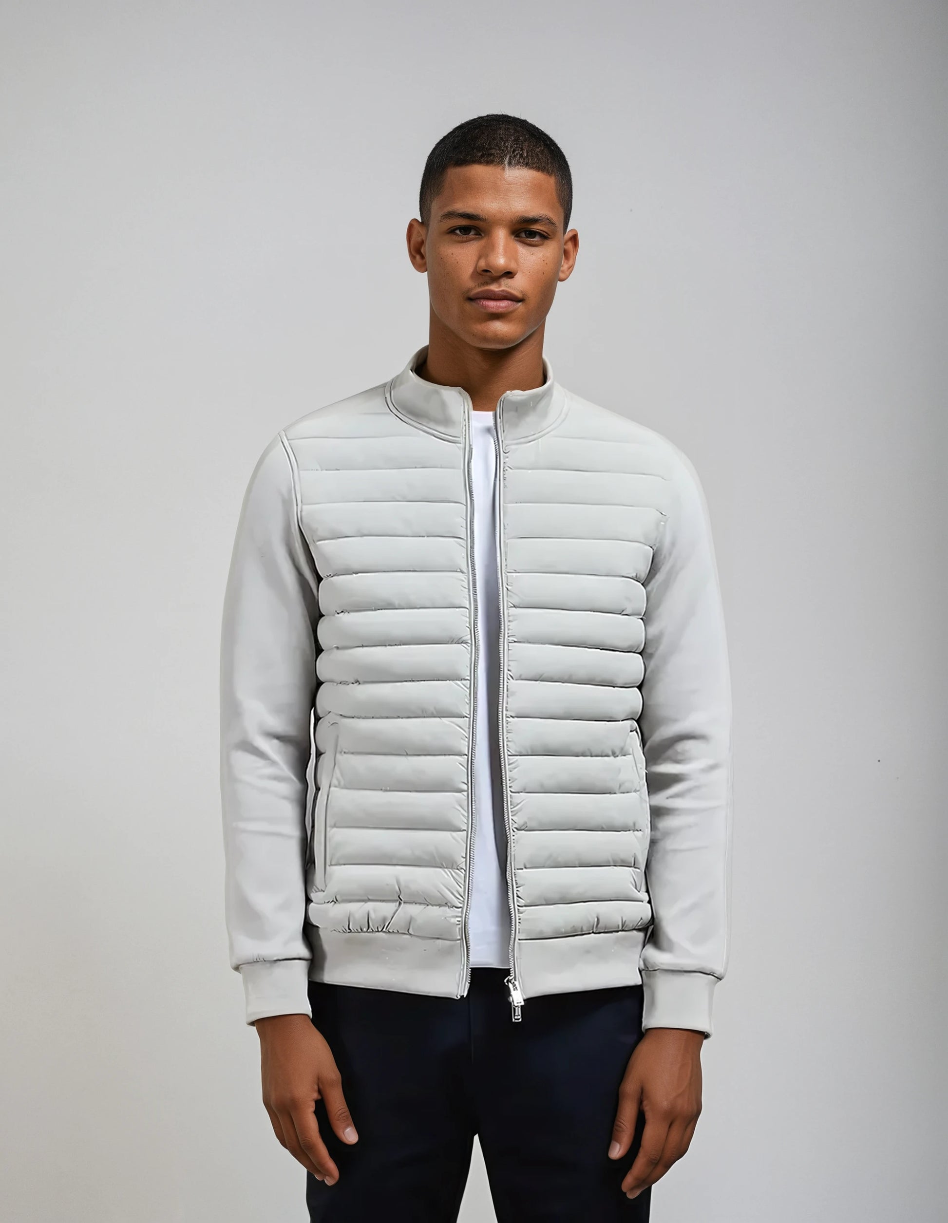 The Cavendish Hybrid Jacket by Jarett London bridges form and function with precision. A padded shell front delivers subtle structure, while refined knit sleeves maintain a streamlined fit. Ideal for the colder months, it’s the layer that completes any smart-casual look with quiet confidence.
